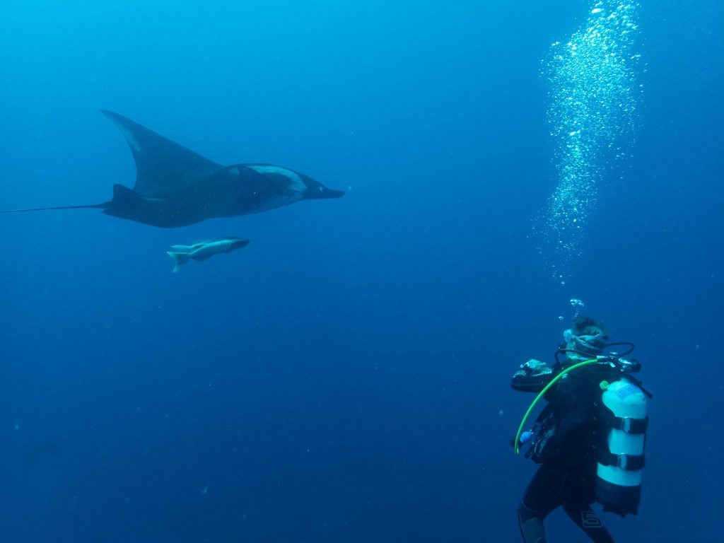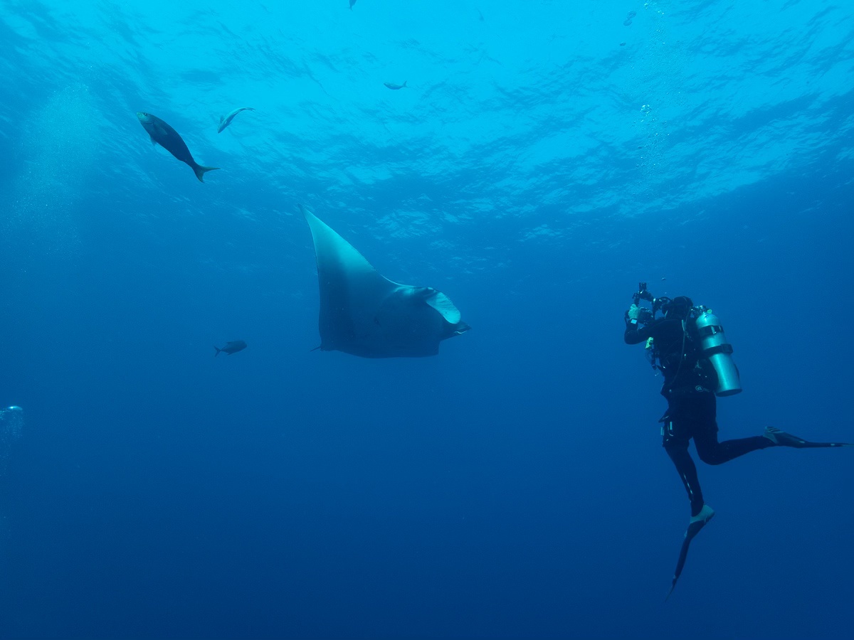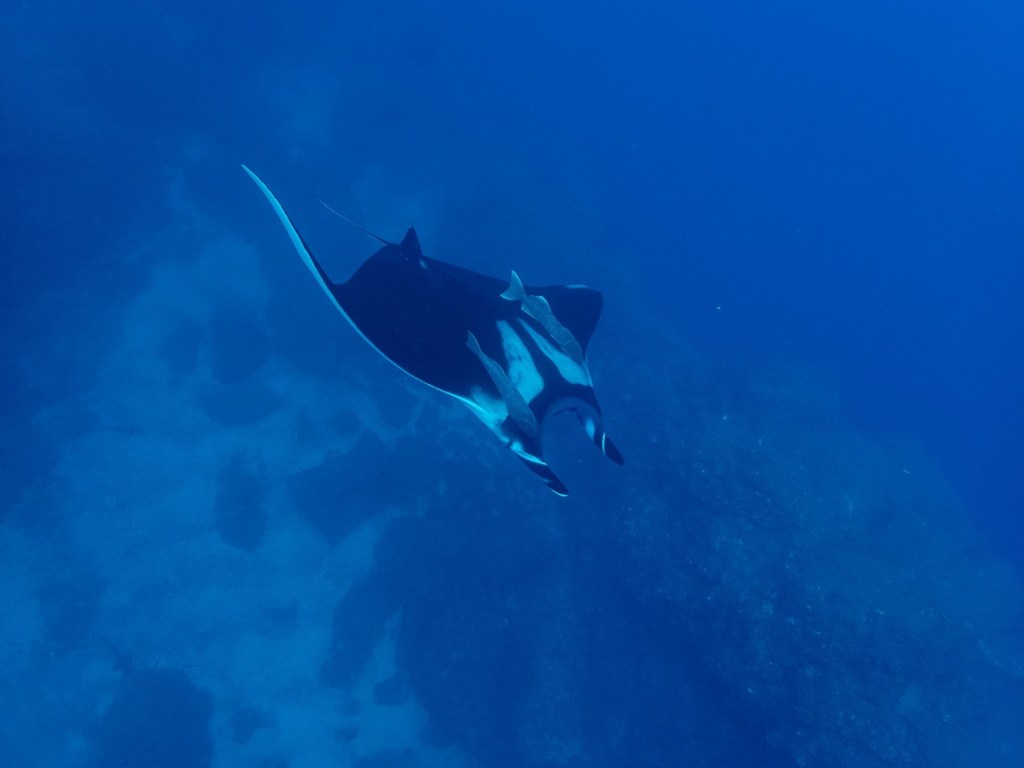 L’une des bouées de repérage des requins de la région se trouve sur le site, c’est un élément essentiel de recherche océanique. Une raie manta a longuement tourné autour de notre petit groupe.