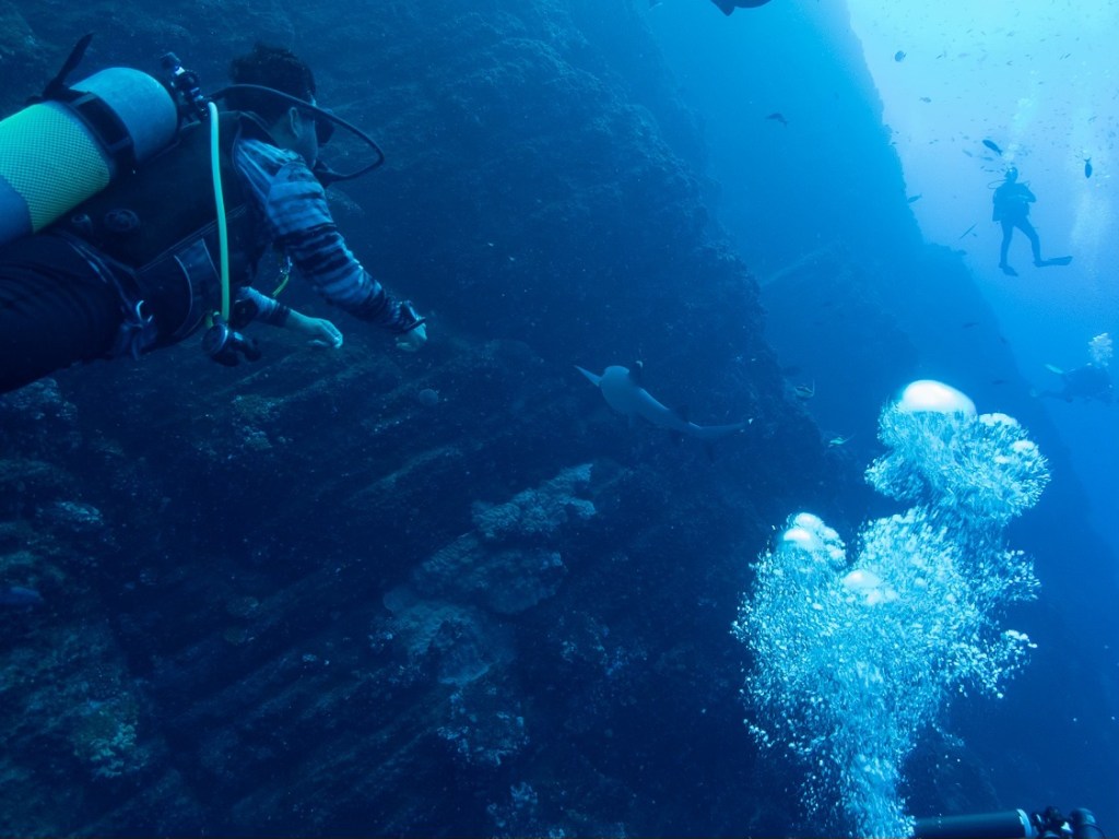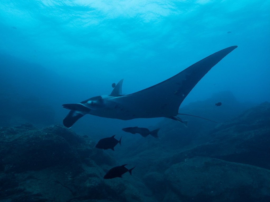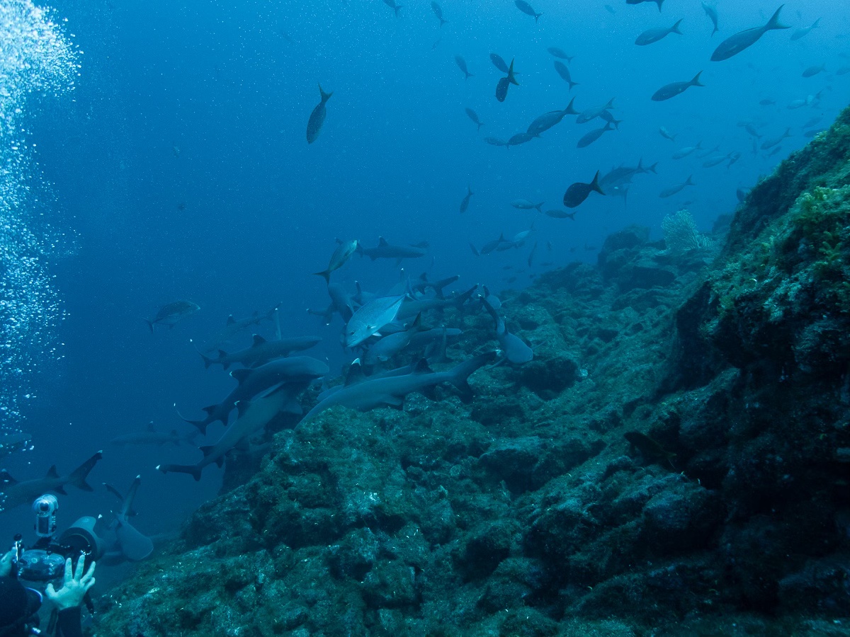 C’est le site le plus fréquenté de Socorro, connu pour ses rencontres avec les raies Manta du Pacifique, joueuses et curieuses. Cabo Pearce est une coulée de lave qui crée un paysage sous-marin linéaire avec deux côtés distincts : vers l’île de Socorro à l’inside et l’océan dans le bleu. Sa station de nettoyage et sa proximité avec les eaux profondes en font un lieu de prédilection pour la mégafaune marine, avec des requins-baleines et des baleines à bosse (en saison), des dauphins et des requins-tigres parfois aperçus en train de croiser sur le tombant. Nous aurons un triplé gagnant depuis la terrasse à 28 mètres : raies mantas, grands dauphins et un banc de requins marteaux dans le bleu.