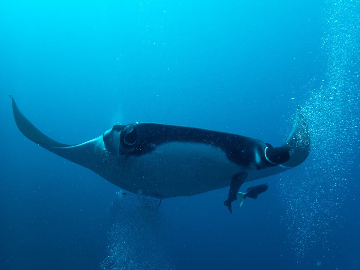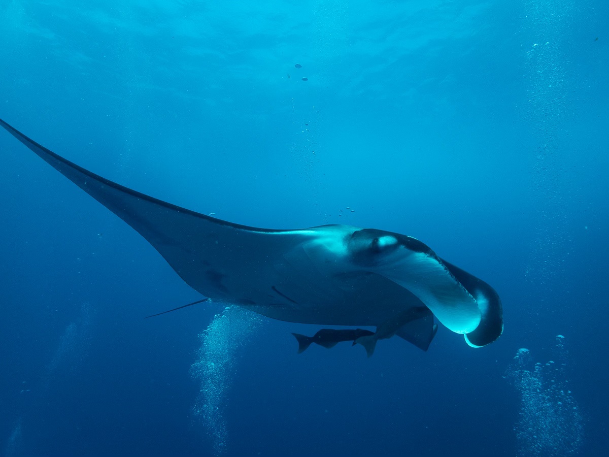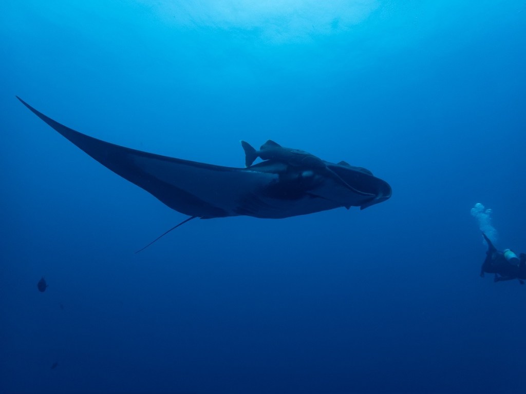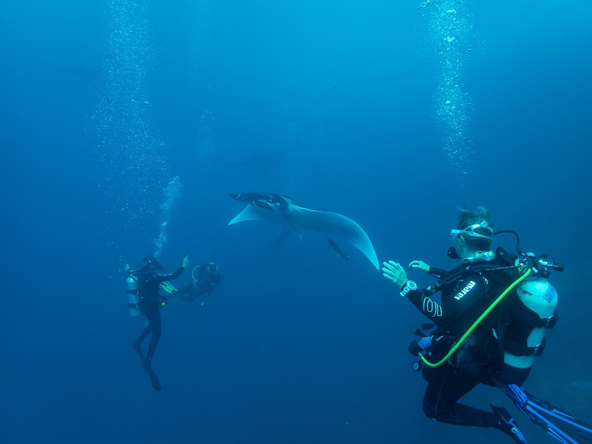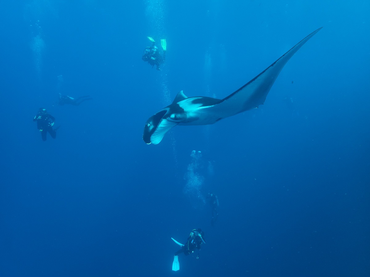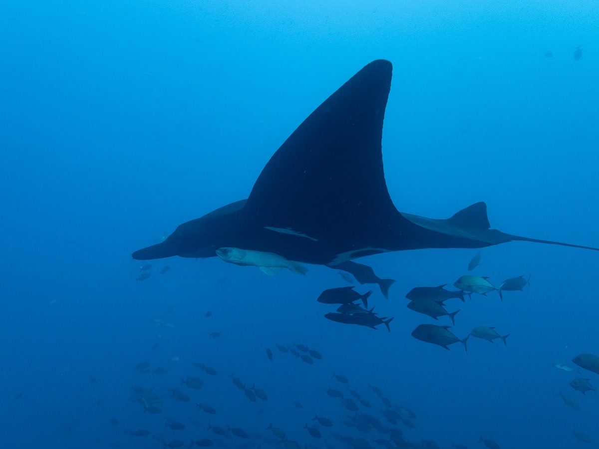 #1 Quelques requins marteaux en surface, 3/4 raies manta passent autour de nous avant d’aller à la station de nettoyage voisine. Elles ralentissent pour nous regarder, c’est impressionnant et même touchant.