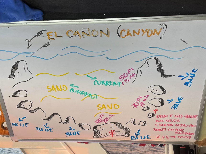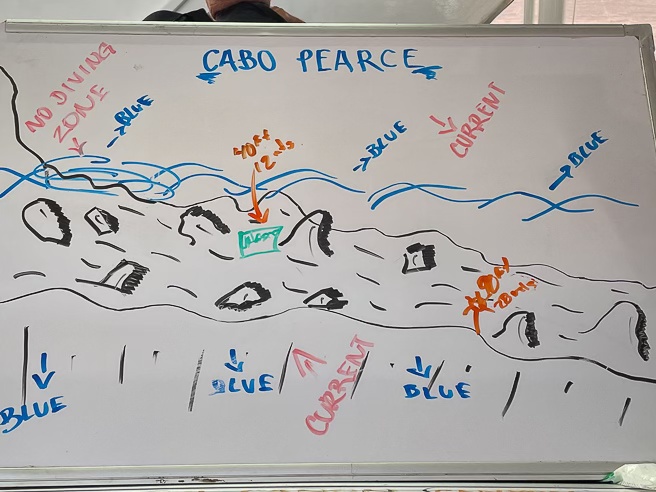 Le briefing de plongée est carrément anxiogène : ressac, courants forts potentiellement ou descendants et vortex… je me dis que je vais coller les palmes mon guide (la preuve en photo).
