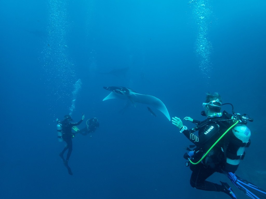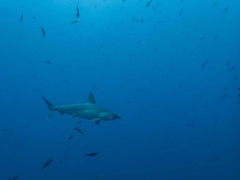 #2 Pendant que les hommes vont nager dans le courant à la recherche des requins marteaux, je reste sur la terrasse avec Heidi pendant 25 minutes : c’est le festival, avec dans l’ordre les raies manta, puis le passage d’une famille de dauphins. Certains dorment en dérivant dans le bleu, 3 adultes viennent nous voir à 3 mètres… Plus personne ne voit les raies manta ! Finalement, un banc de requins marteaux passent à une vingtaine de mètres, un peu loin pour la visibilité.