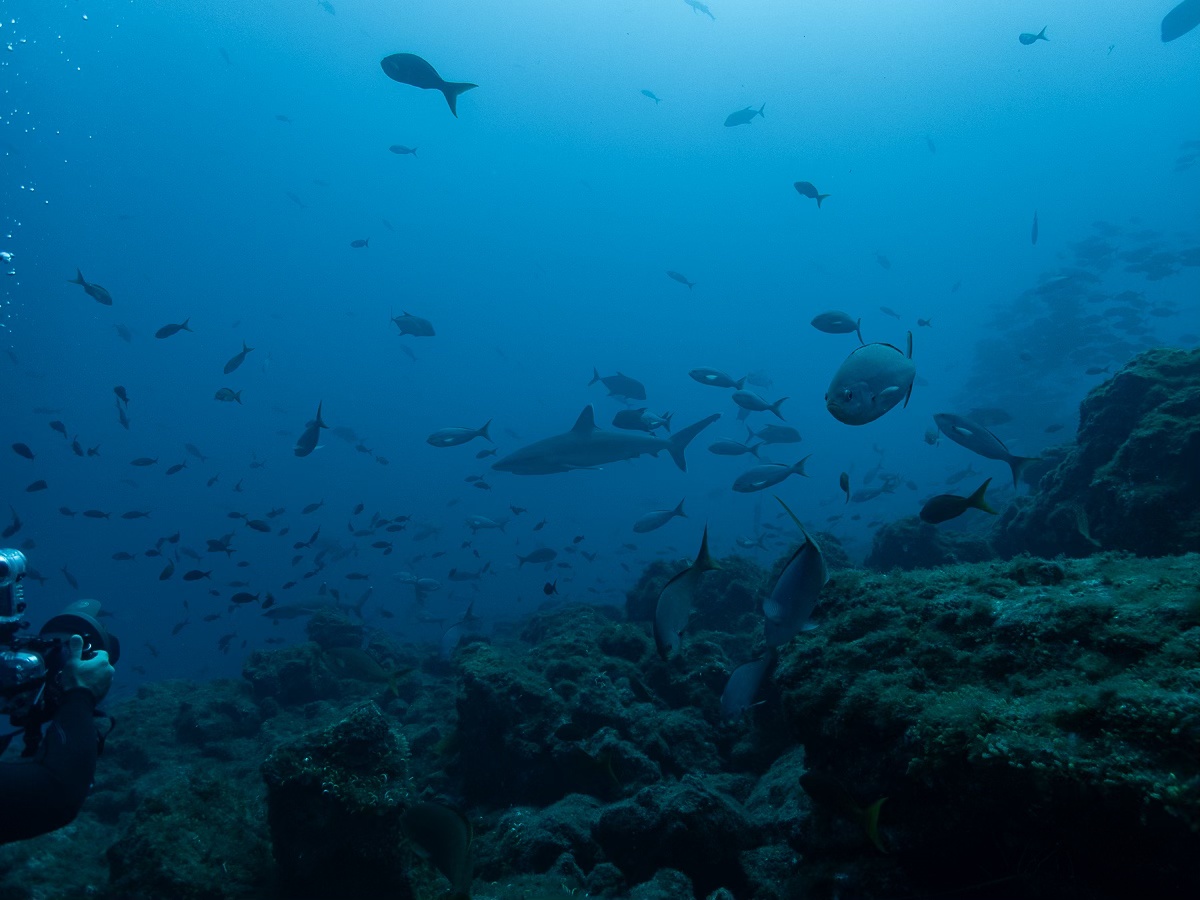 Courant modéré sans trop de houle, nous sommes restés à l’abri des rochers en attendant le passage des requins. Visibilité correcte. - Paramètres : 49 minutes, profondeur max de 26 mètres.