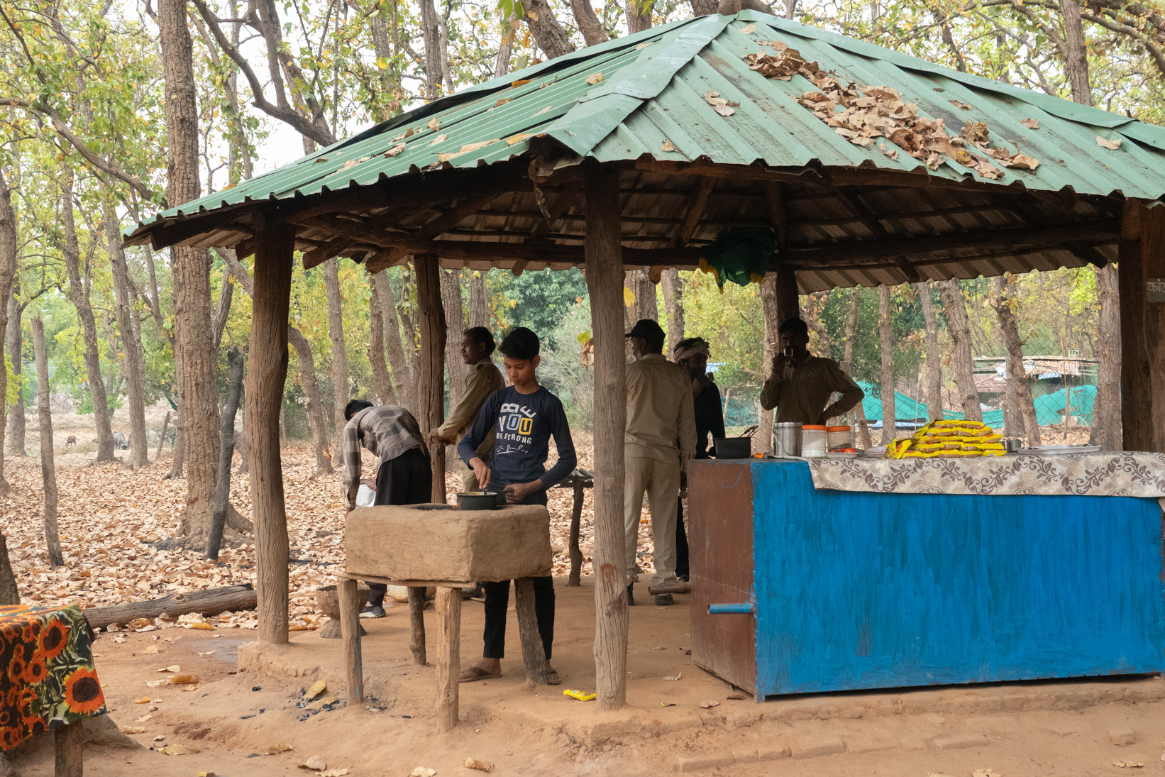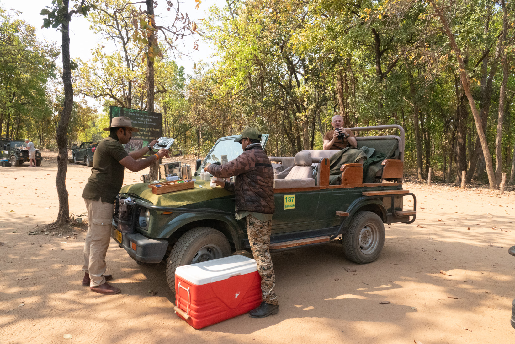 Nous avons le privilège de faire des journées complètes, avec un permis spécial. Nous prenons donc le petit-déjeuner et le déjeuner sur le capot de notre voiture ! Il existe des zones prévues à cet effet dans la zone tampon, proposant notamment des toilettes. Des locaux y proposent des snacks, samossas, massala chai, etc.