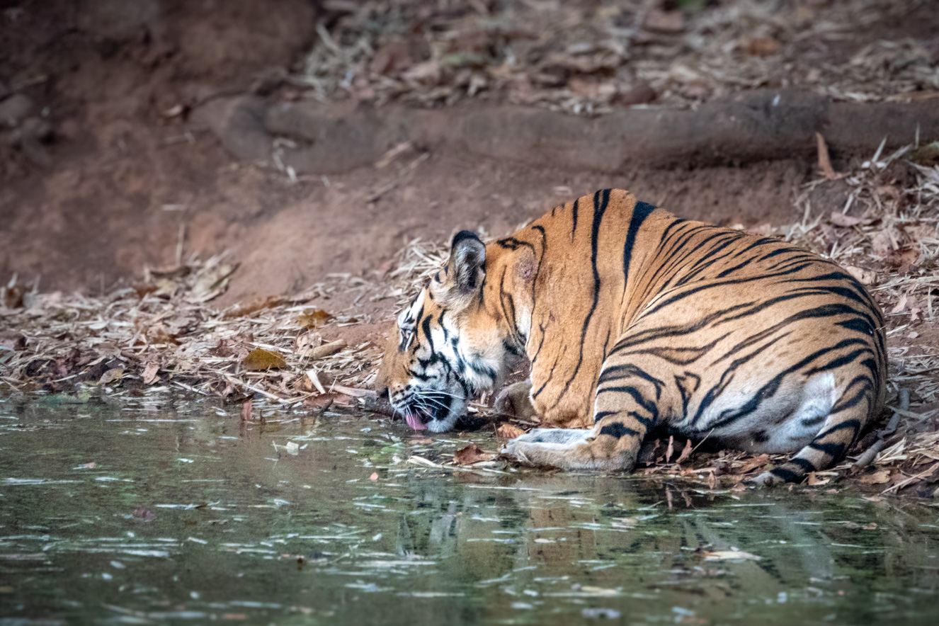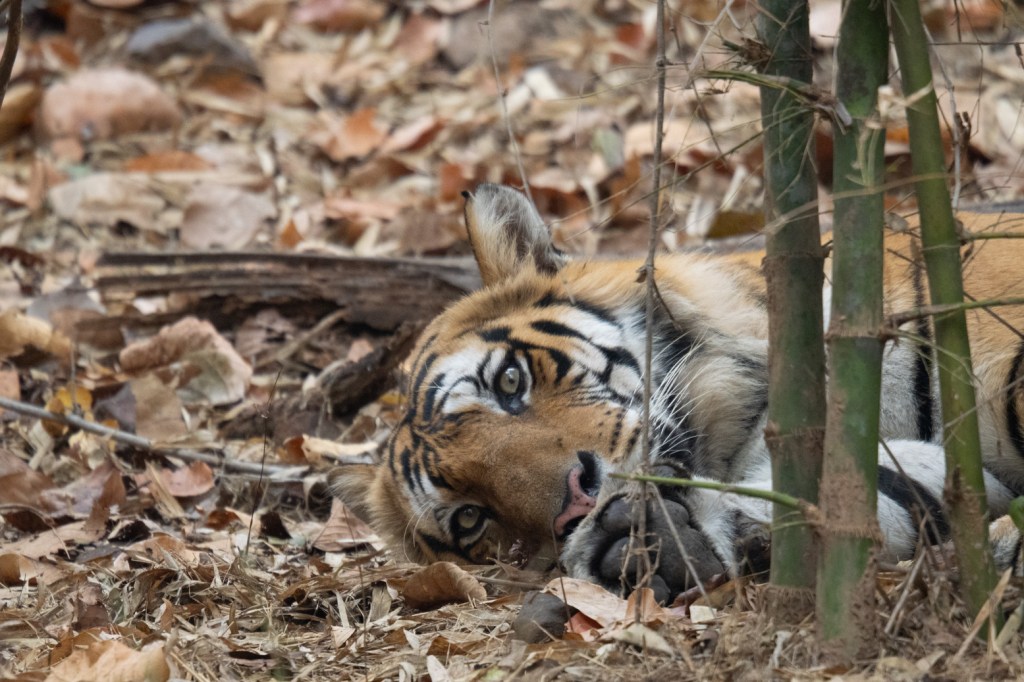 En fin d’après-midi, c’est une famille de 4 tigres qui sort de sa cachette, une cascade sèche en cette saison qui offre un abri frais. Les 20 voitures présentes sur le secteur ont attendu 1h30 sous un soleil de plomb. Charl nous a même bricolé une tente et nous avons piqué du nez 🙂