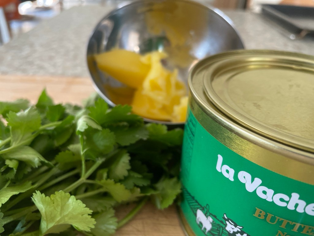 5 – ajoutez le reste de ghee, la coriandre hachée (réservez 2 cuillères à soupe), salez et poivrez, mélangez.