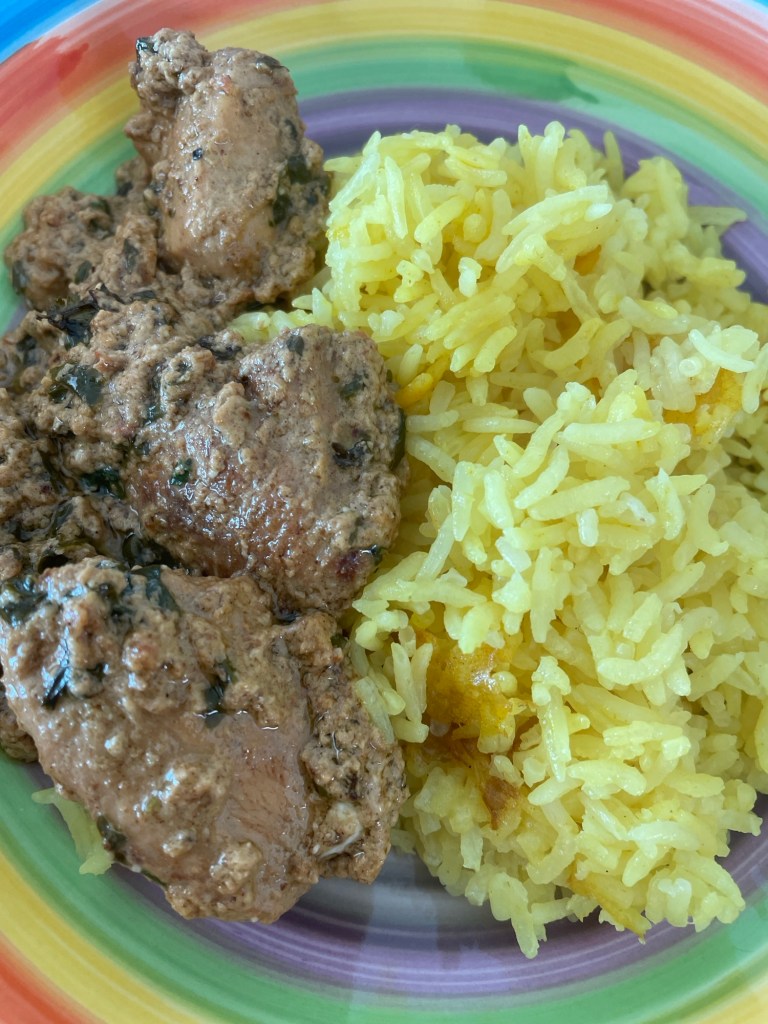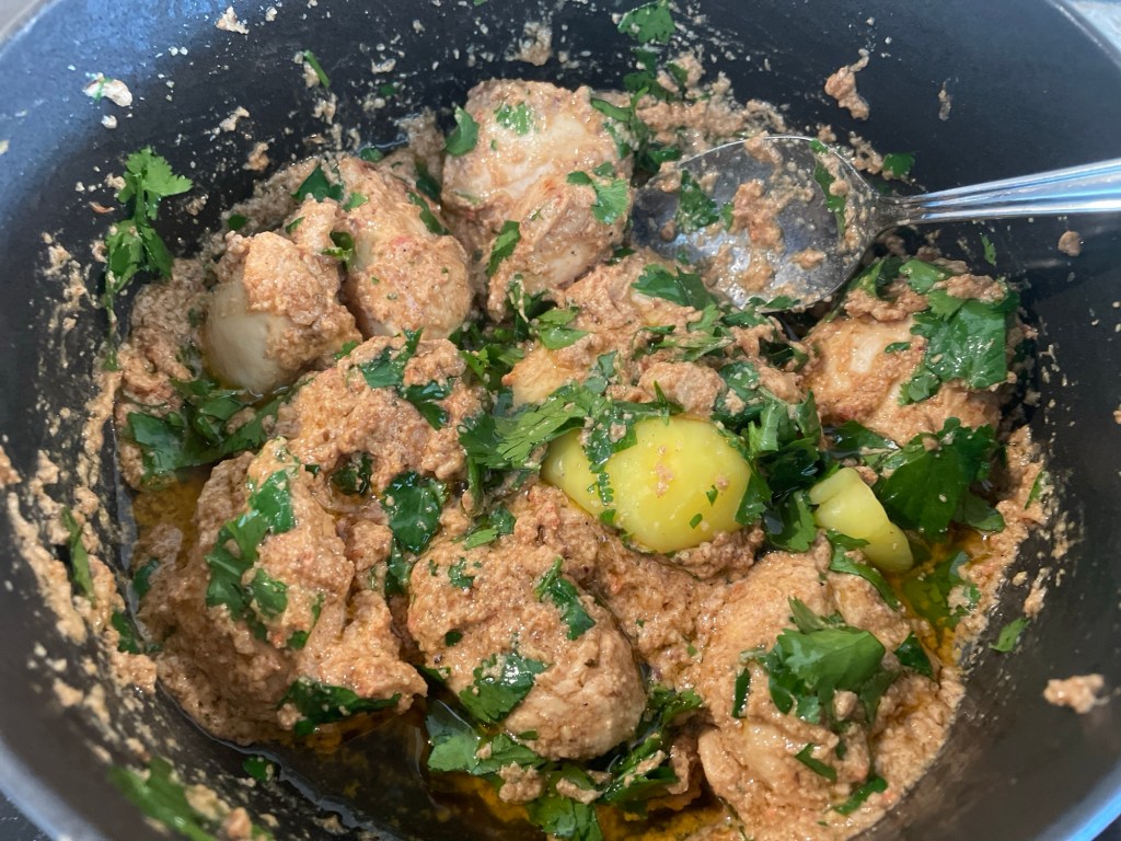 7 – ajoutez la crème fraiche et le reste de coriandre hachée, servez avec du riz et / ou des naans.