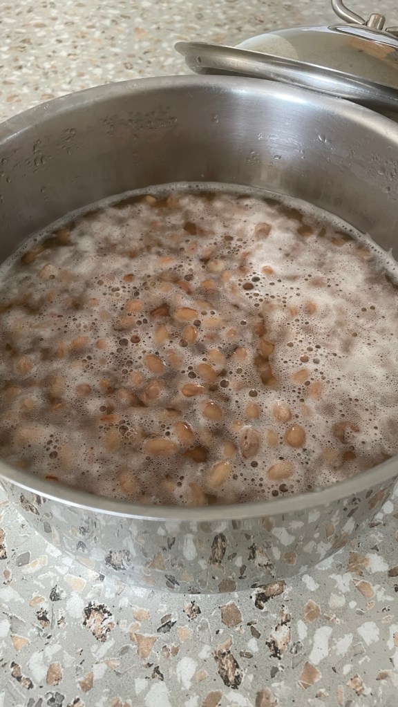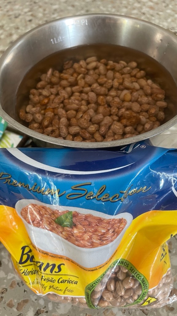 Le lendemain, égoutter les haricots et les mettre dans un autocuiseur, ajouter les feuilles de laurier et 4 tasses d’eau. Faites cuire à feu vif jusqu’à ce que la pression monte puis baisser le feu et cuire pendant 30 minutes. Les haricots doivent être tendres et al dente.