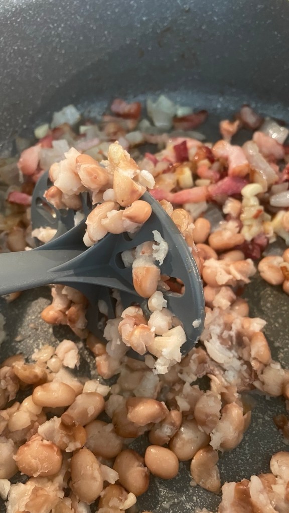 Ajouter une bonne louche de haricots (sans bouillon) dans la poêle et laisser cuire pendant une minute environ. Avec le dos d’une cuillère en bois, écraser les haricots jusqu’à ce qu’ils aient la consistance d’une pâte.