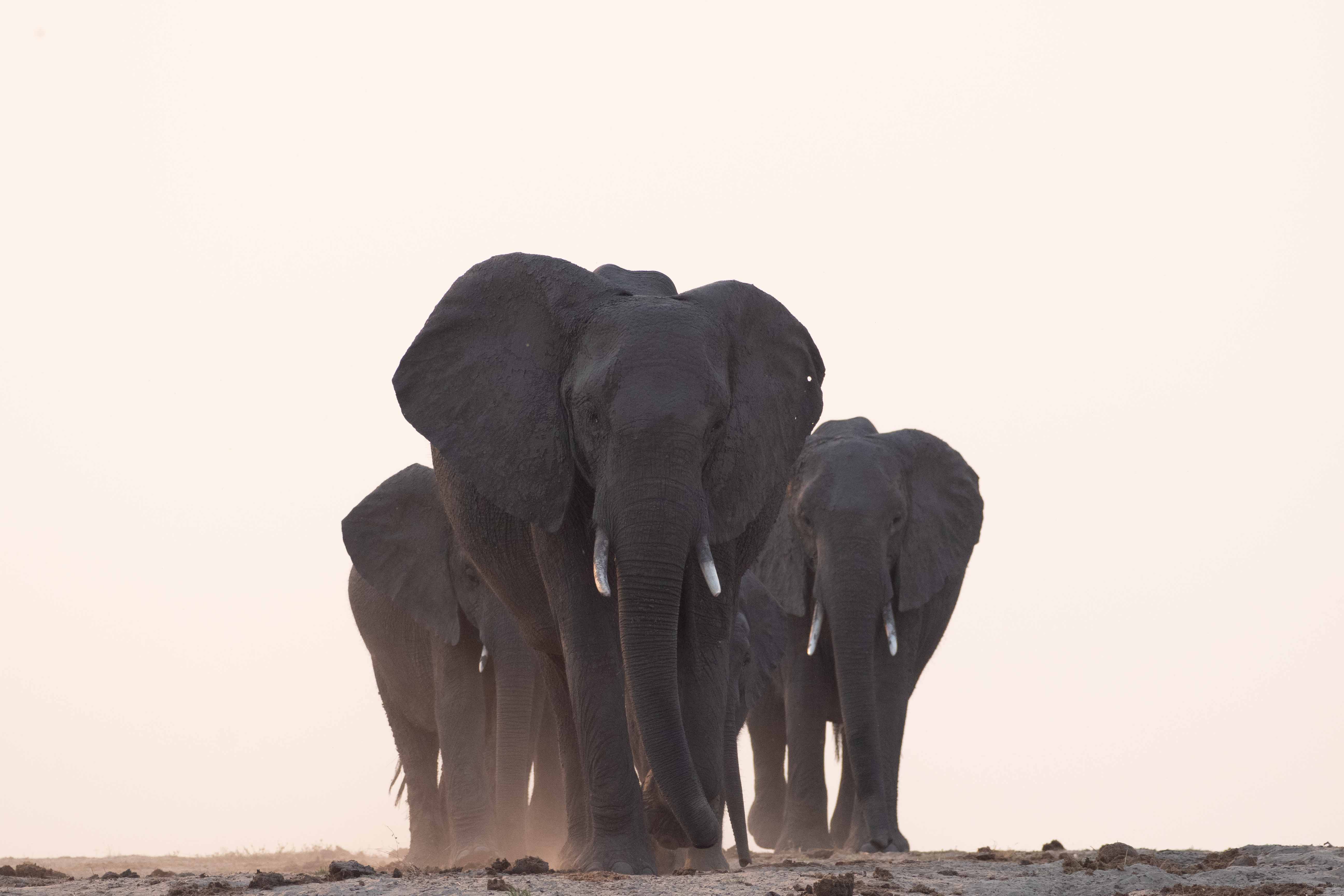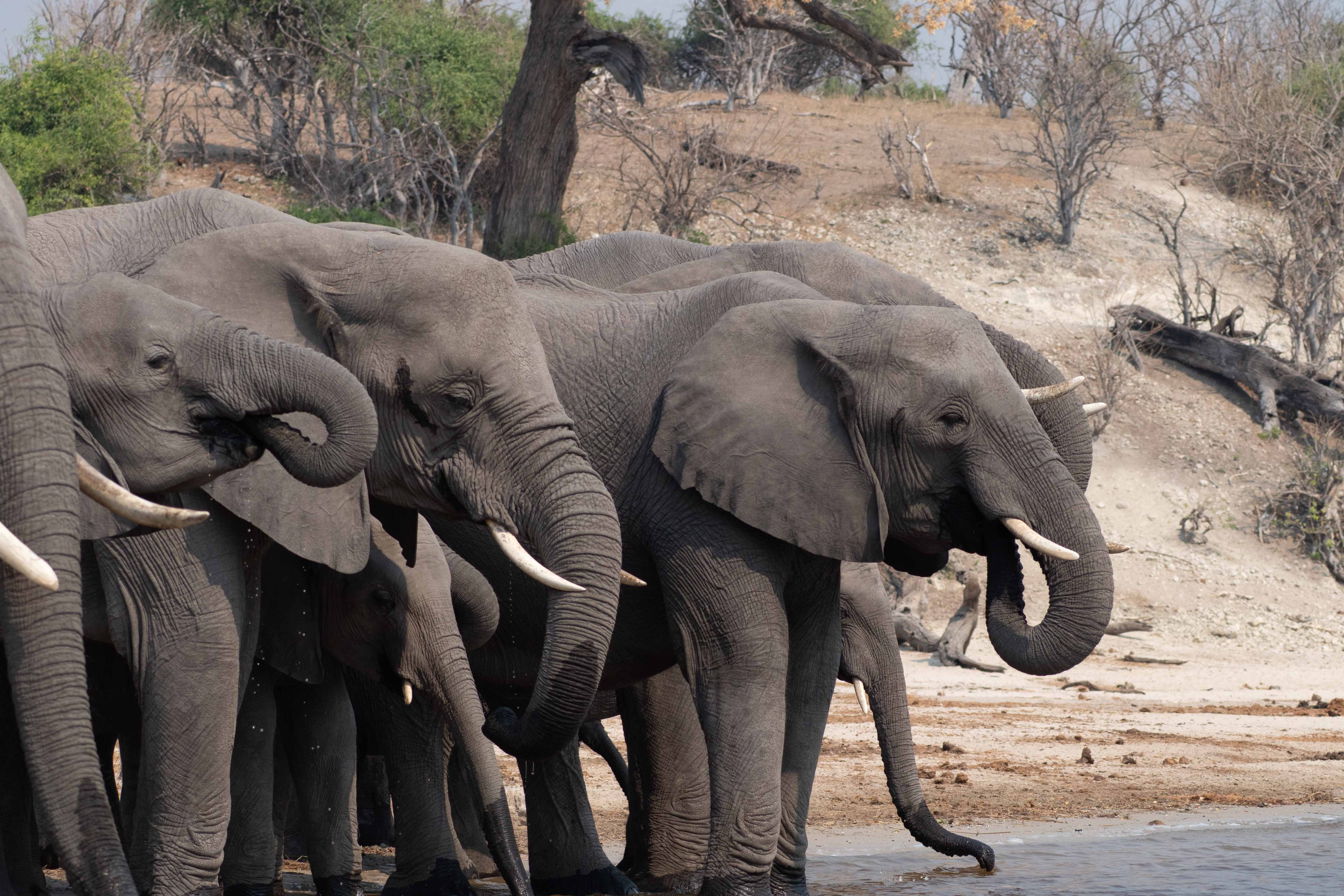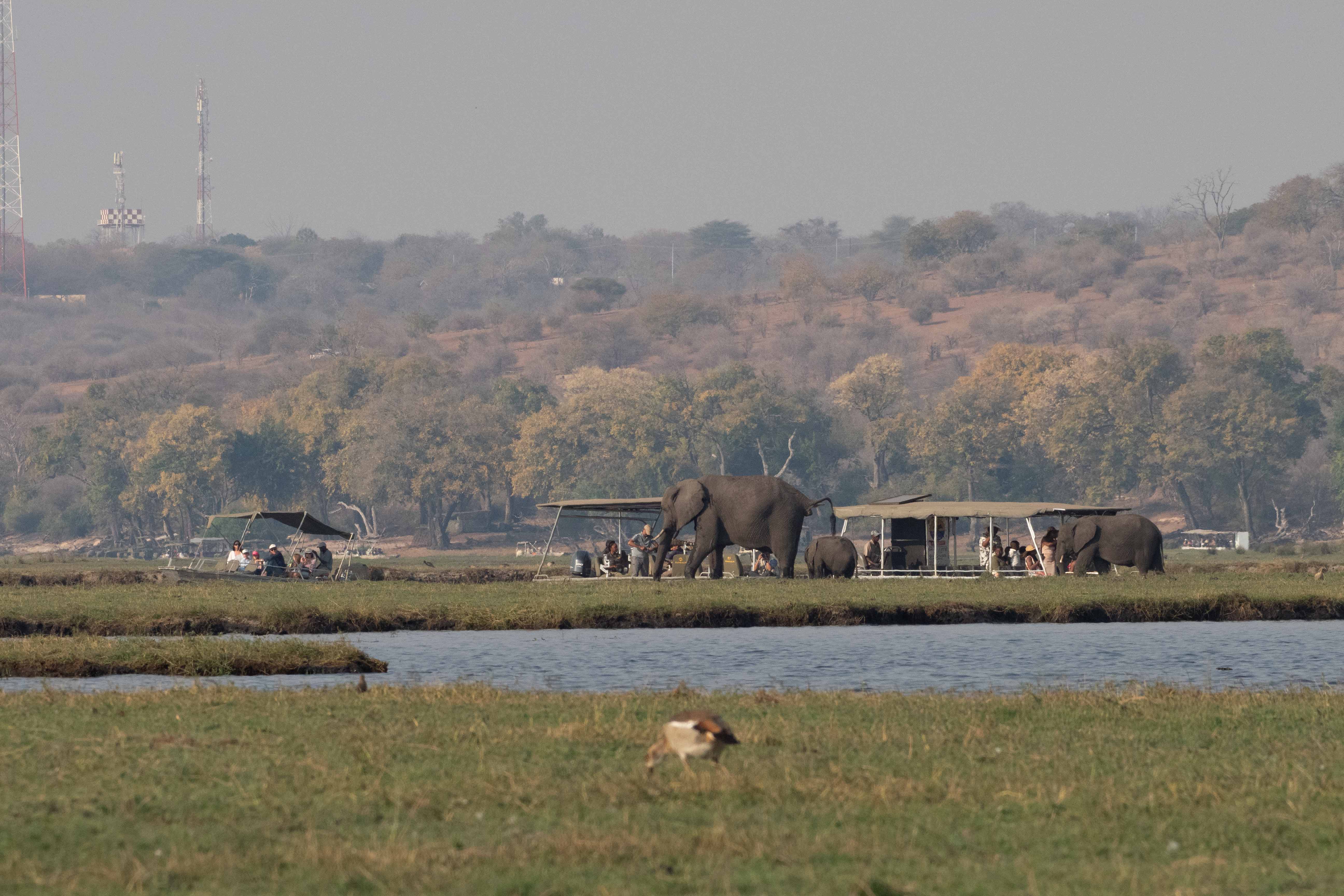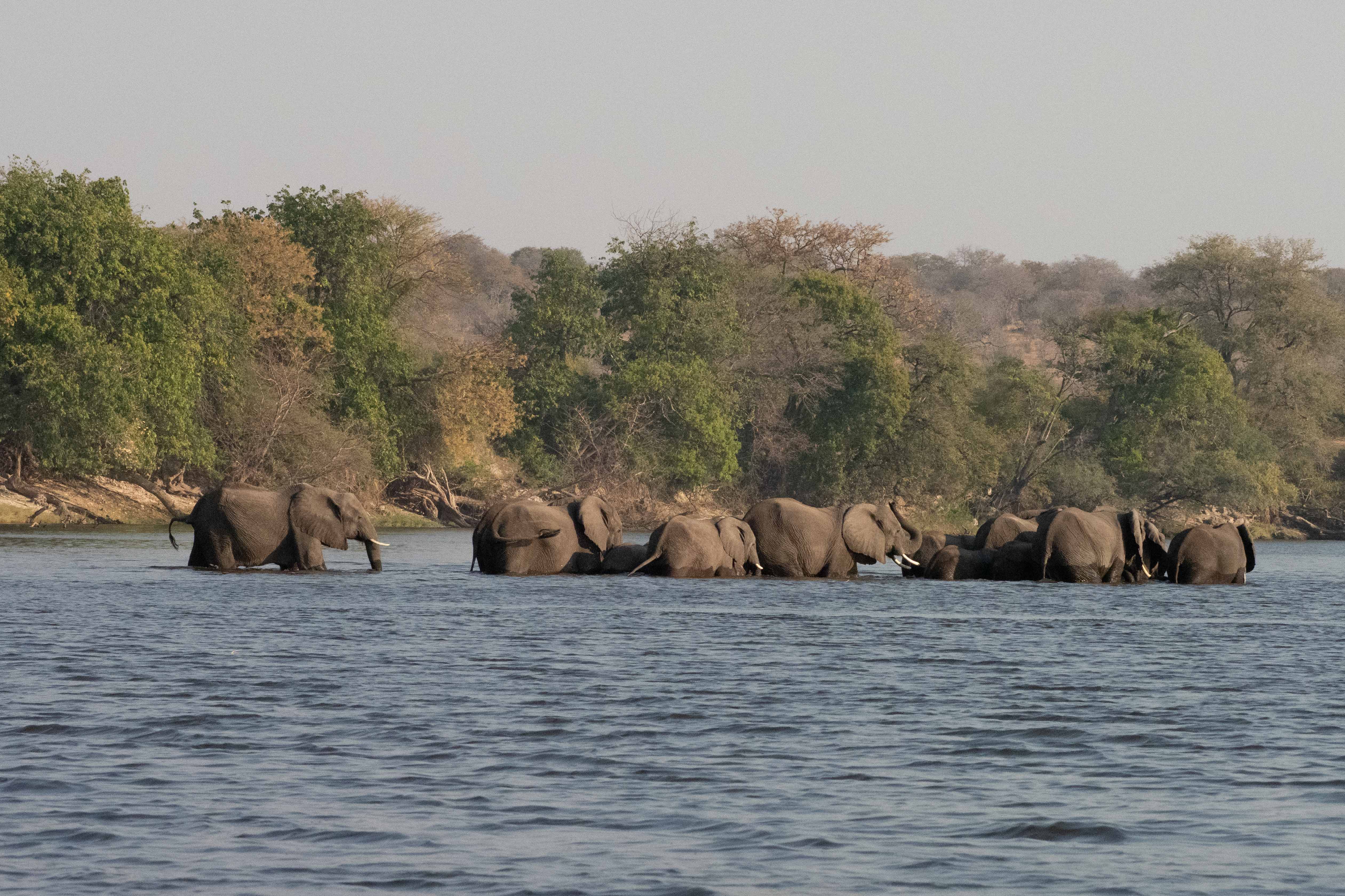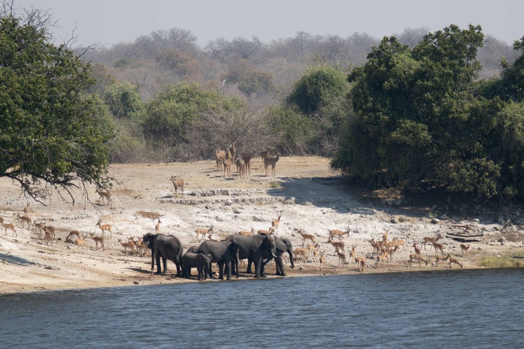 Pendant la saison sèche (d’avril à octobre), d’énormes rassemblements d’éléphants ont lieu au bord de l’eau. Ils passent une partie de la journée dans le bush, puis descendent vers la rivière en fin de journée. Certains traversent simplement pour aller manger l’herbe verte des îles.