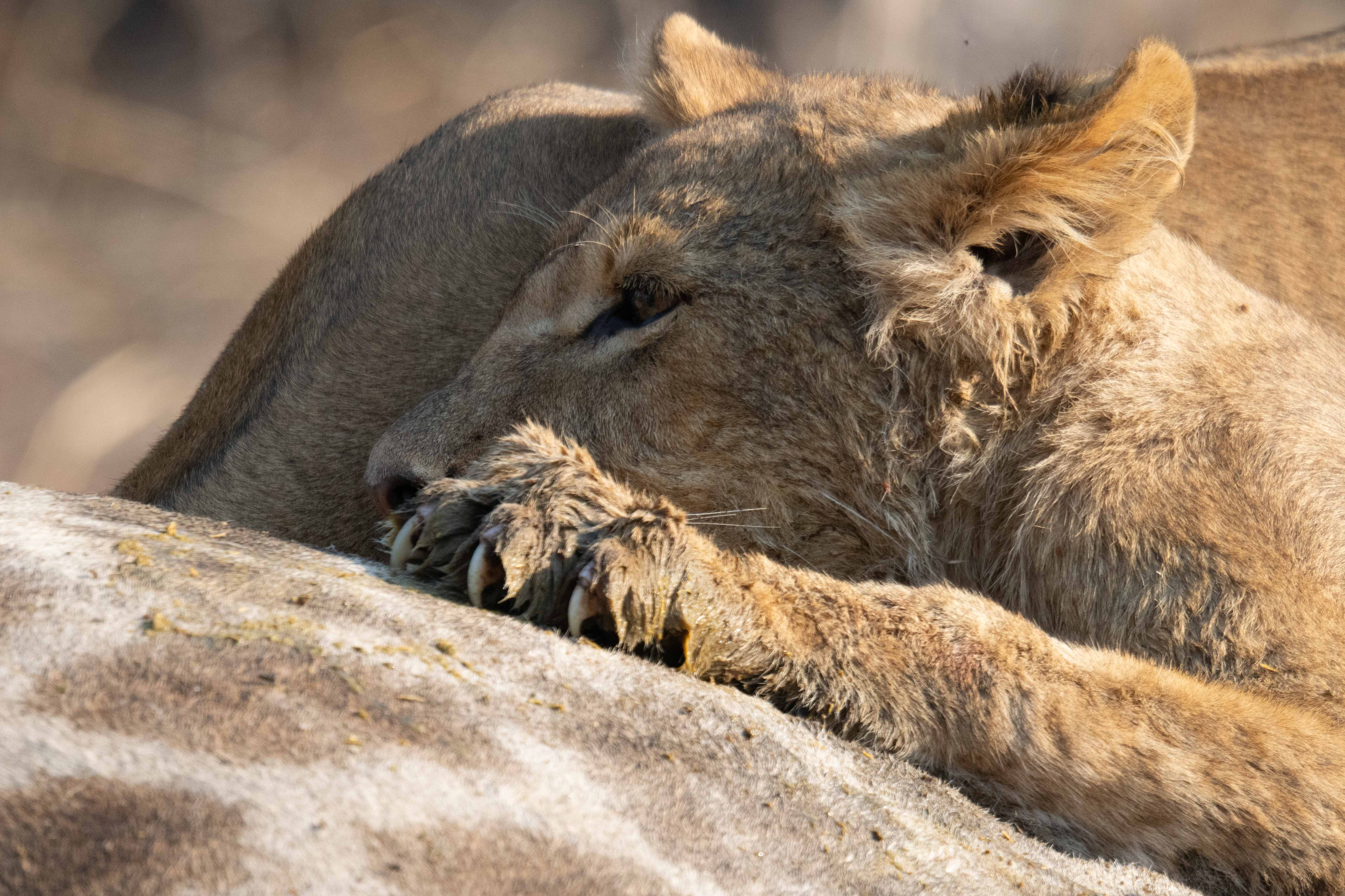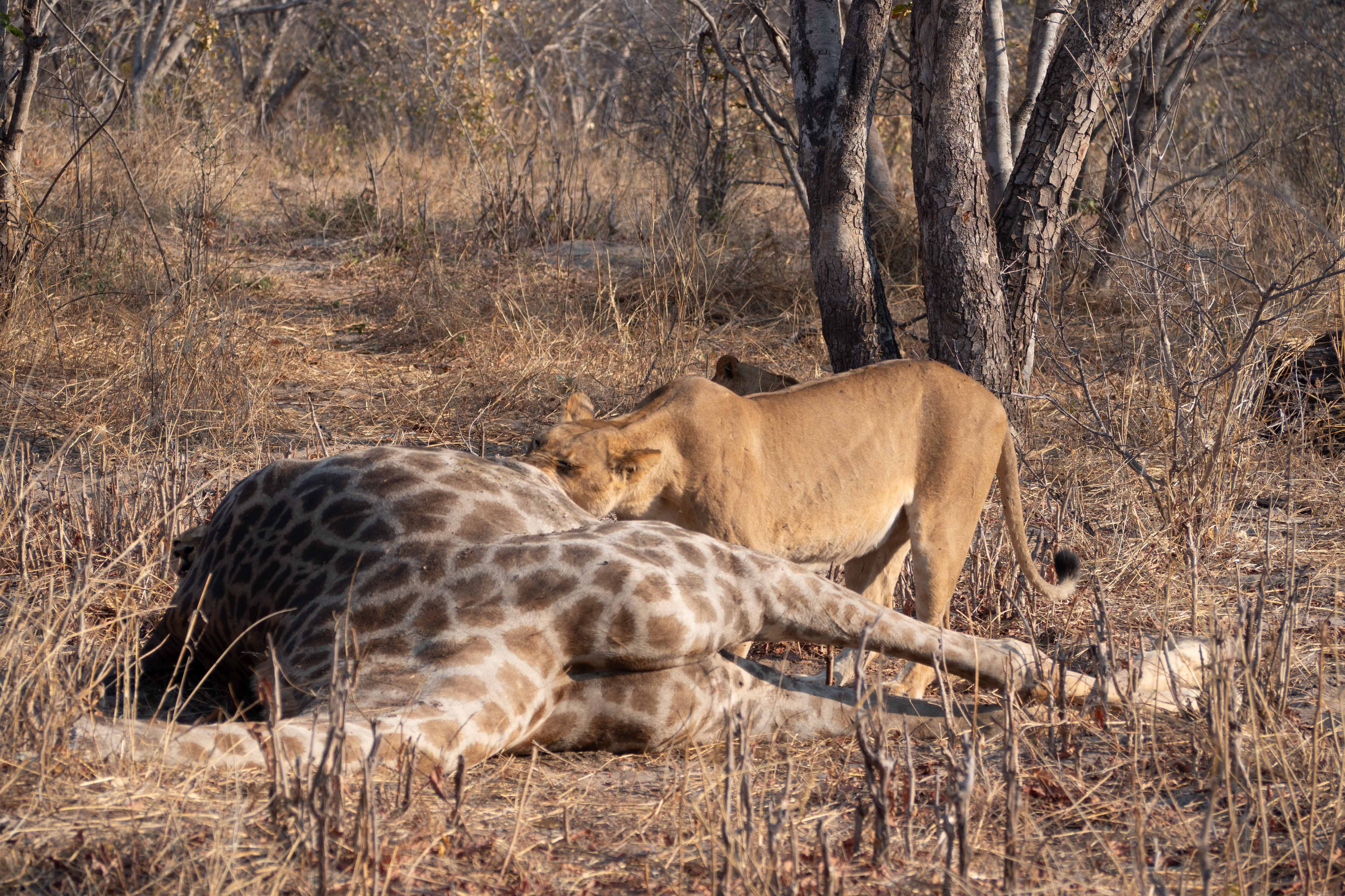 Nous avons vu une famille de lions se nourrir sur une carcasse de girafe, juste au bord de la piste. C’est toujours fascinant mais le point noir est la masse des véhicules qui se pressent. Les animaux semblent détendus mais je trouve que c’est trop. C’est un choc quand on arrive de Serondela !