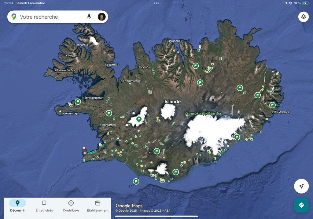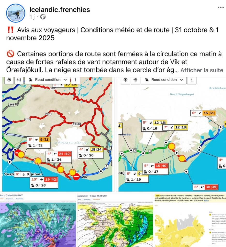 Pour une première expérience islandaise, le choix du Road Trip sur la fameuse route 1 s’est imposé, le choix d’organiser moi même ce voyage également. J’ai démarré sérieusement mes recherches début 2025. Il y a sur Internet un nombre incroyable de sources d’information sur l’Islande, en complément des sites officiels. Le site de nos compatriotes Islandic Frenchies est intéressant et inspirant. Pour suivre l’actualité touristique ou prendre la mesure des variations météorologiques, leur page Facebook est un must.
