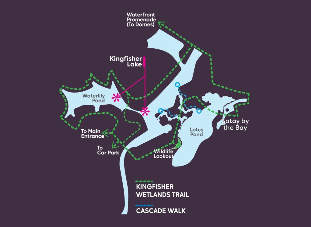 Kingfisher Wetlands est un espace naturel de 15 000 m2, créé ex nihilo au coeur des Gardens by the Bay. Il se situe entre le hawker centre Satay by the Bay et les dômes floraux.