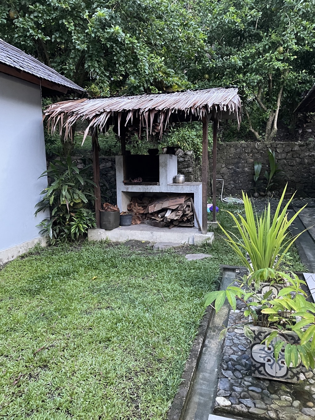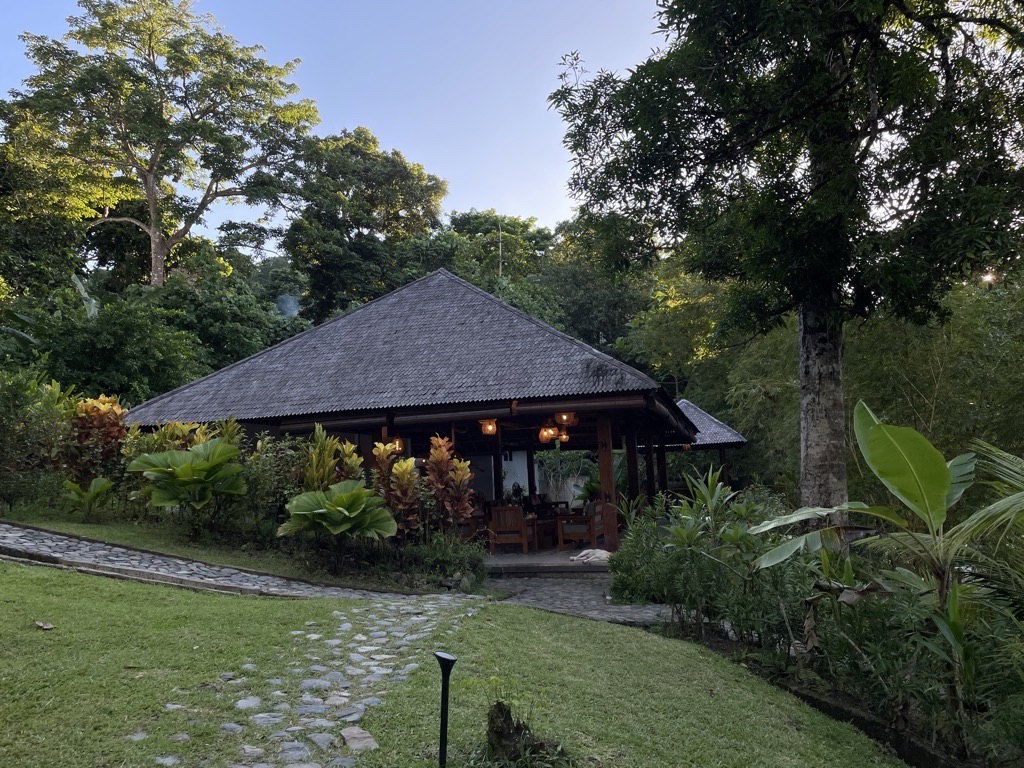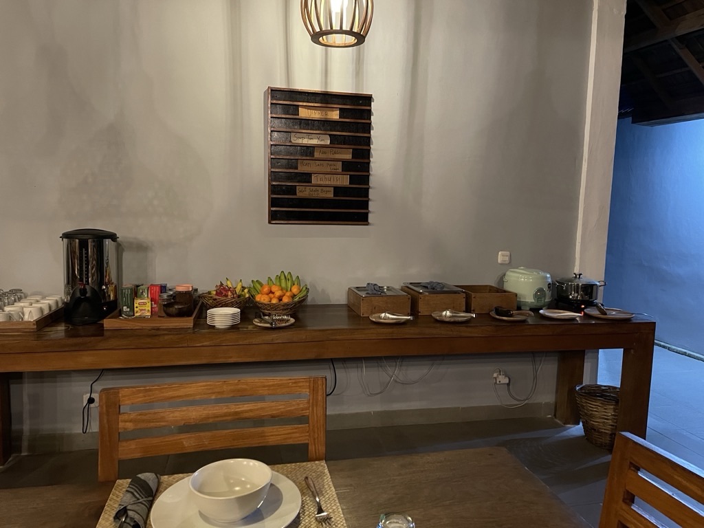 Sri a conçu des menus équilibrés – légumes à tous les repas, soupe le soir – pour faire découvrir la cuisine indonésienne. La cuisine est locale, épicée modérément, uniquement avec des produits frais. Les repas sont servis sous la forme de buffet. Eau, thé et café sont à volonté toute la journée.