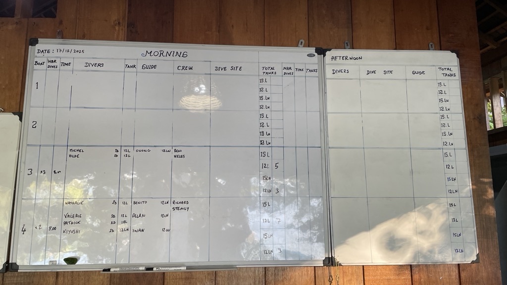 L’organisation mise en place par Matthieu est bien rodée : des tableaux renseignent sur les groupes, les spots, les bateaux, les arrivées et les départs.