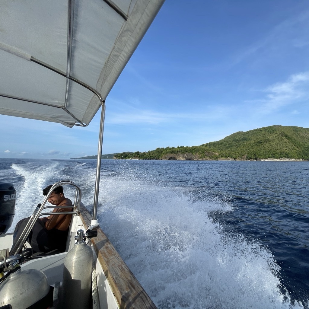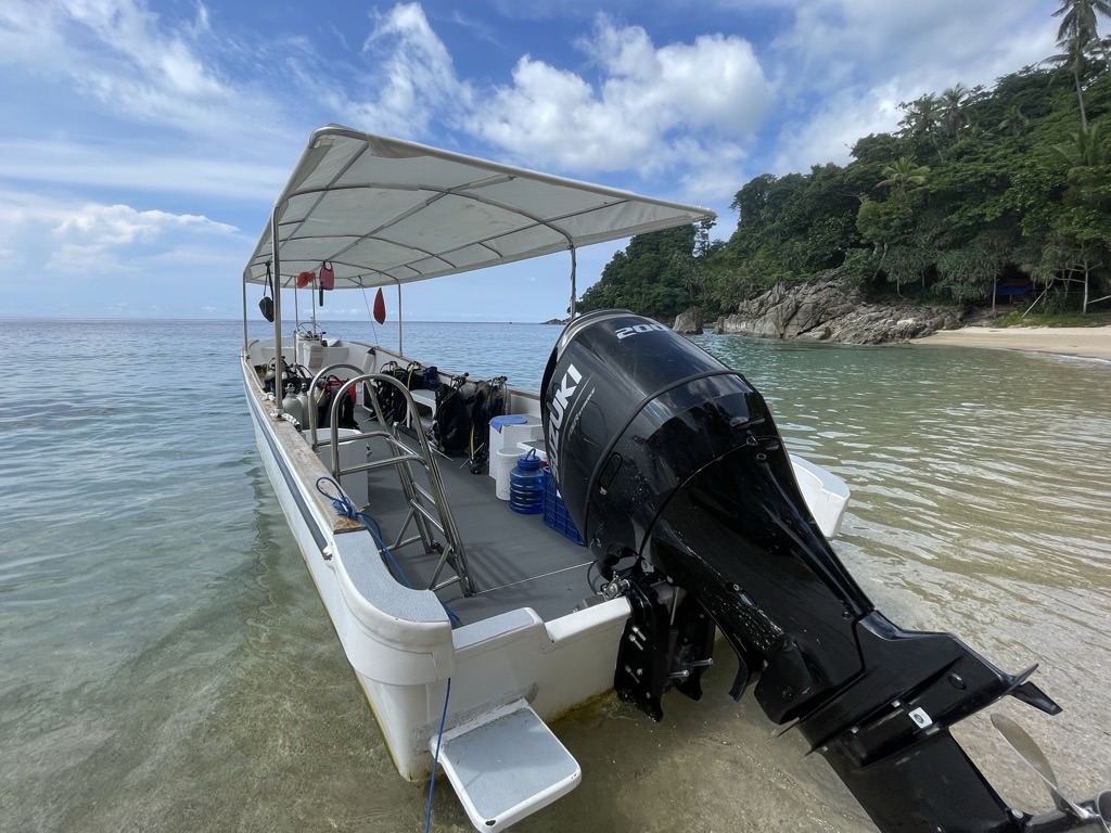Les bateaux sont amarrés devant le club de plongée et amenés au bord de la plage pour l’embarquement et le débarquement. Ils sont super fonctionnels, spacieux avec un toit pour se protéger du soleil pendant l’intervalle de surface et des espaces de rangement sous les banquettes. À bord, le nécessaire de sécurité bien sûr, mais aussi de l’eau fraiche, thé, café et biscuits pour l’intervalle de surface.