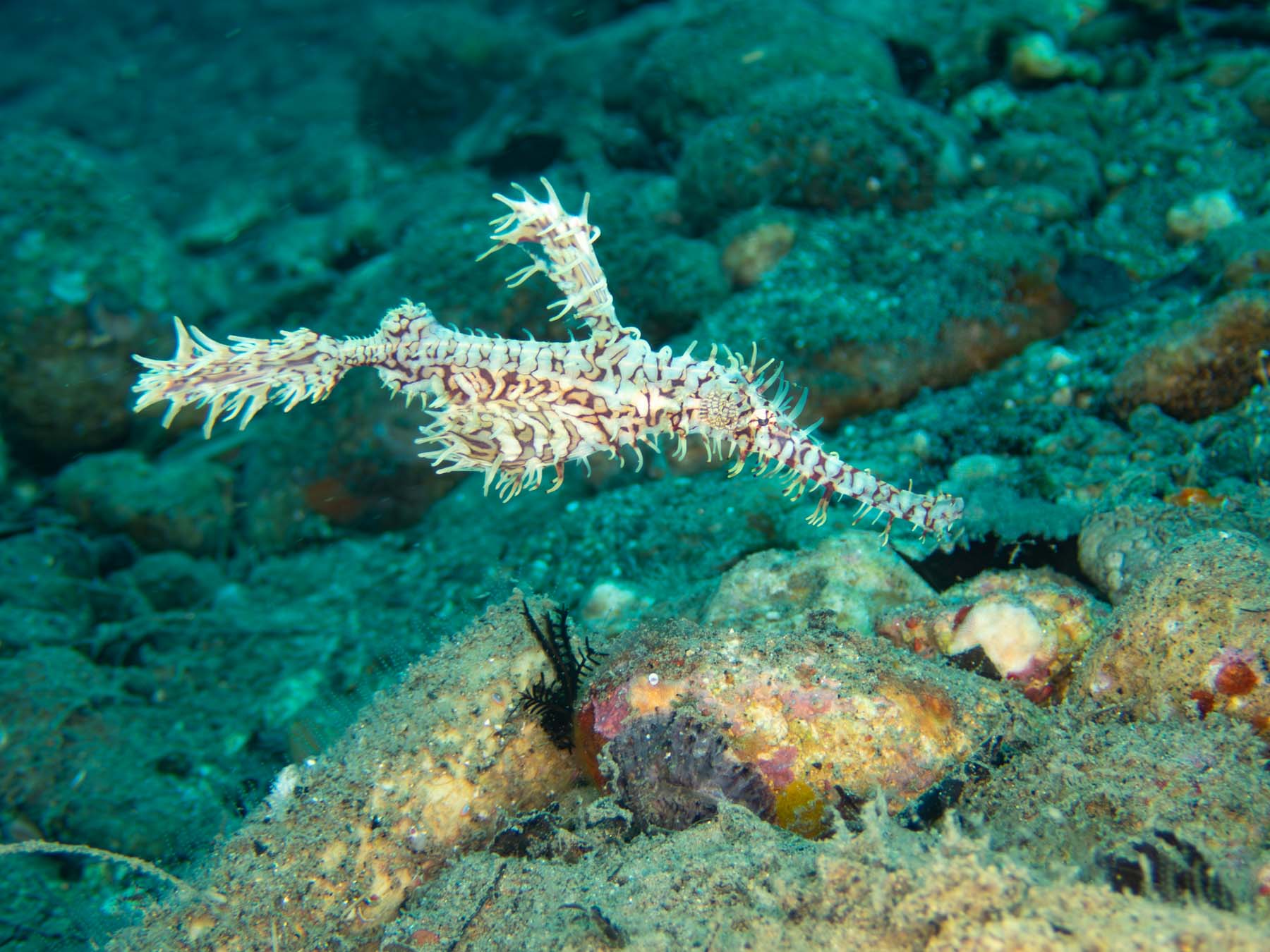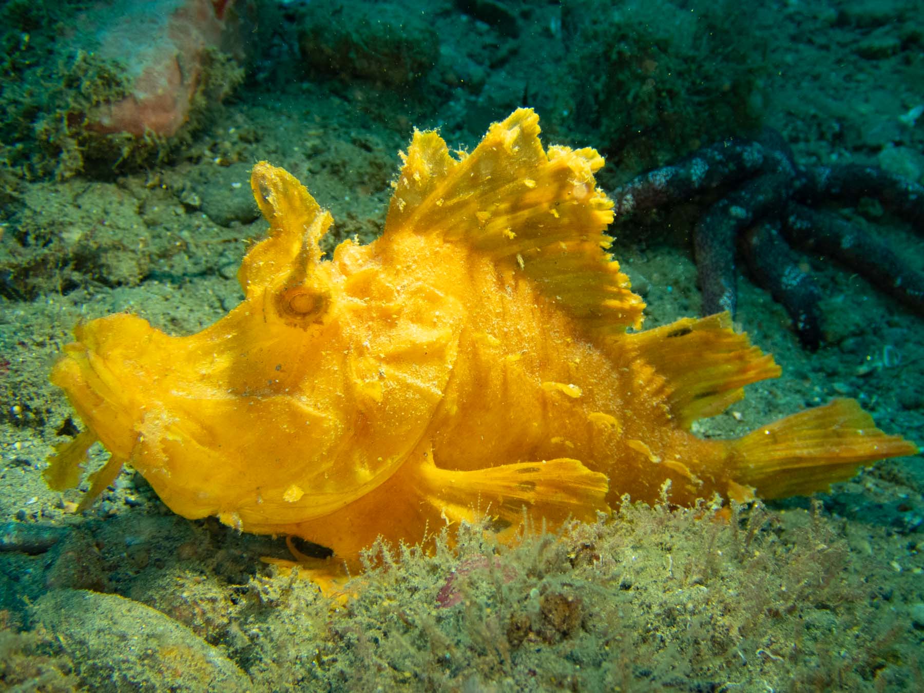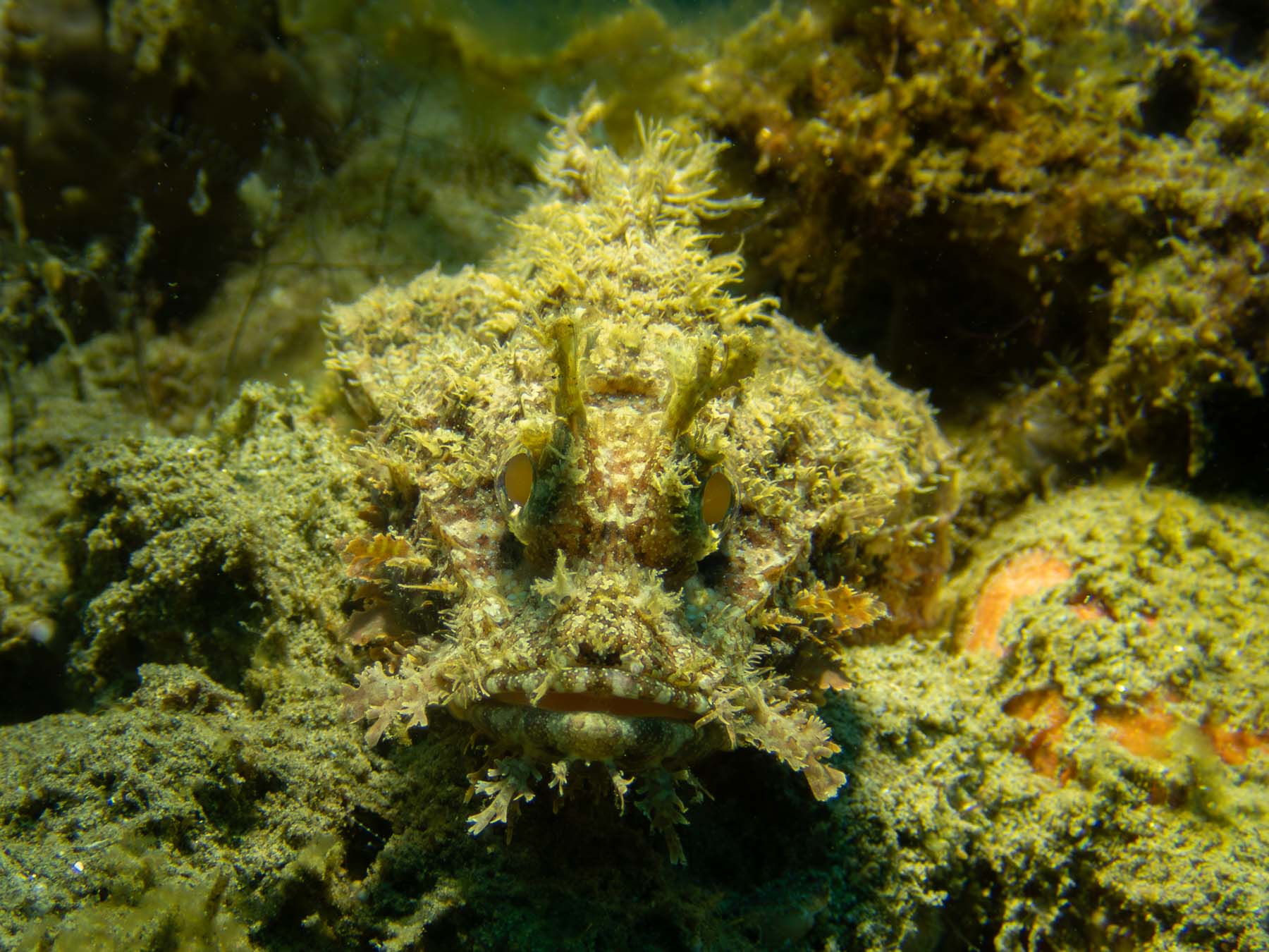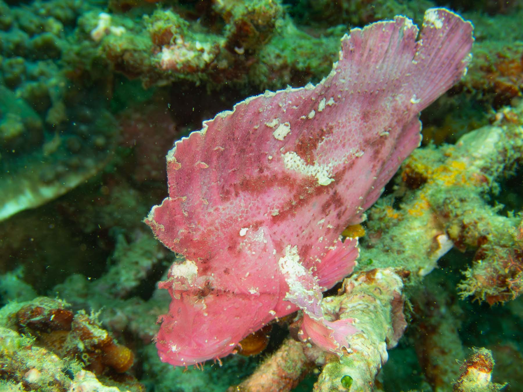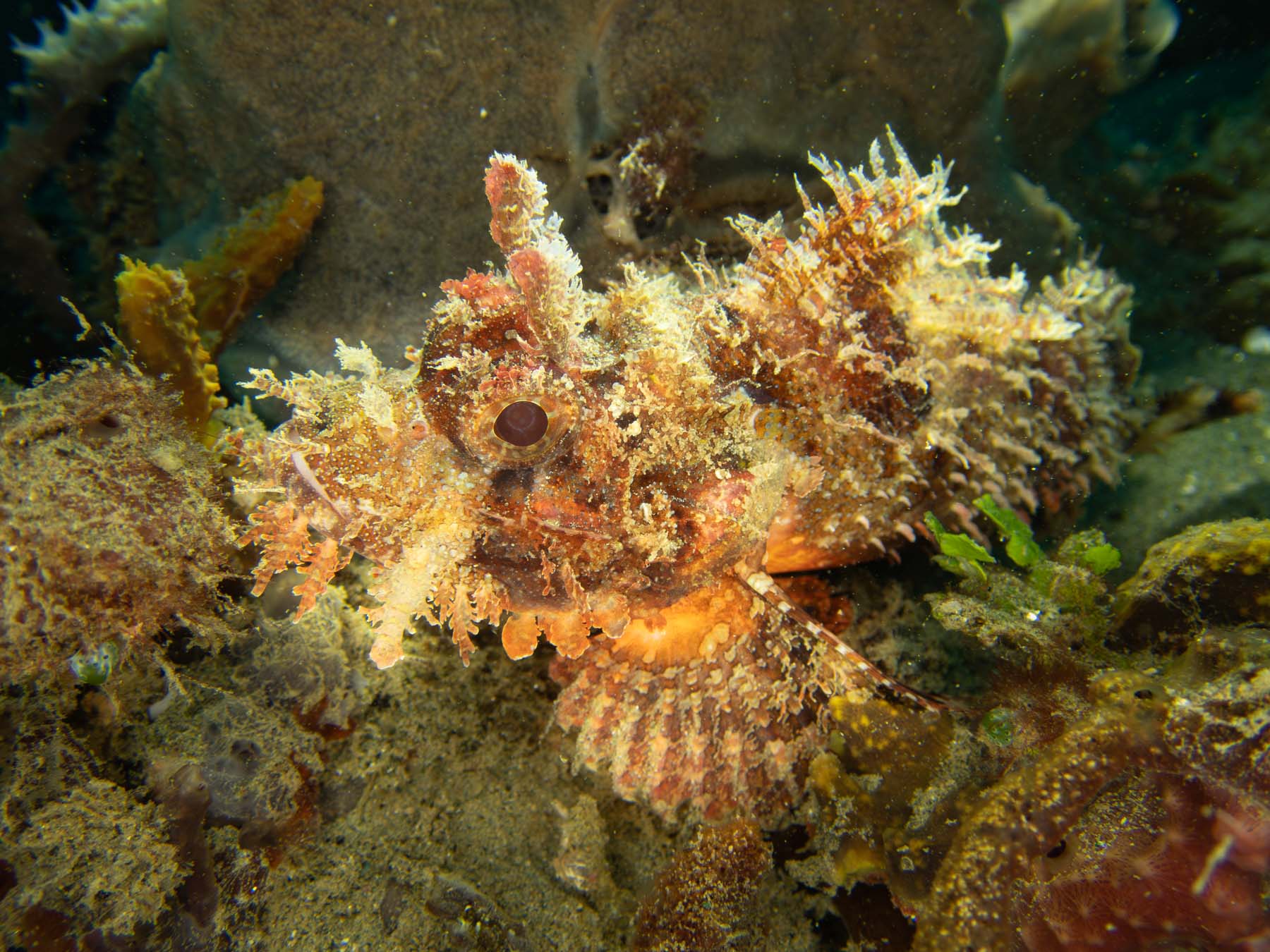 Les scorpaeniformes sont des poissons benthiques, avec une crête osseuse et souvent des épines venimeuses. Certaines espèces sont des maîtres dans l’art du camouflage. Les plongeurs viennent à Ambon pour voir des Rhinopias.